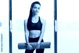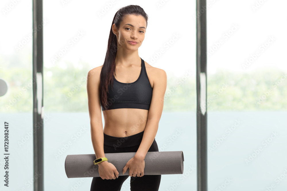Young female holding an exercise mat in a gym