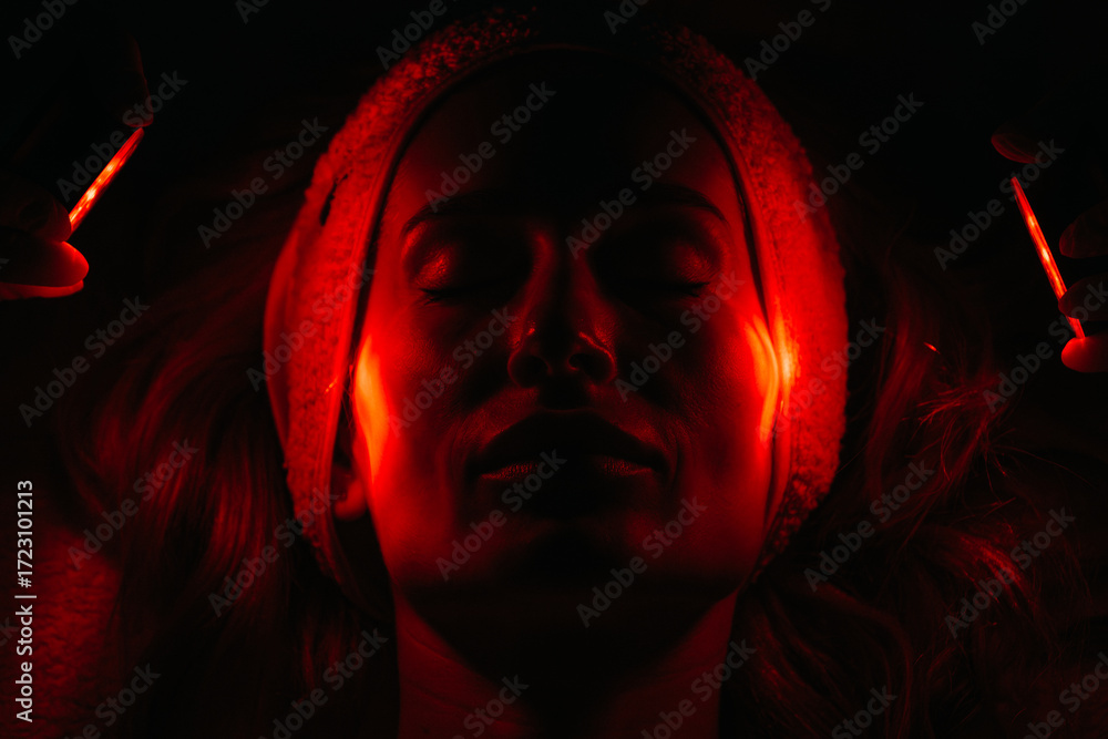 Female cosmetologist performing LED light therapy treatment on a clients face, showcasing rejuvenation process with glowing red lights and serene ambiance in a professional setting