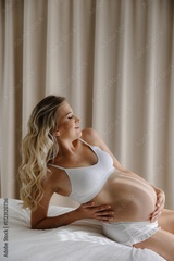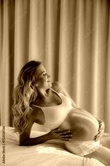 Radiant Expectant Woman Embracing Motherhood on Bed with Serene Pose, Embracing the New Chapter