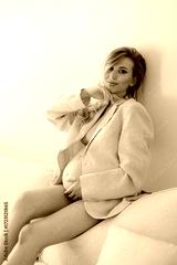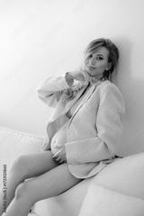 Serene Expectant Woman in Blazer Posing on Couch, Embracing Pregnancy and Anticipation