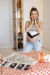 Excited Pregnant Woman Anticipating Motherhood with Sonogram and Baby Announcement, Pregnancy Joy