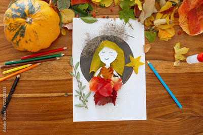 Sweet child, boy, applying leaves using glue while doing arts and crafts at home