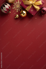 A vertical bright holiday scene features wrapped gifts with gold ribbon, festive ornaments, and a rich red background. Ideal for Christmas and New Year greeting cards, promotions, and seasonal visuals