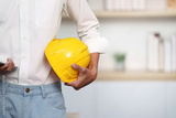 Engineer with hard hat and smartphone in modern office