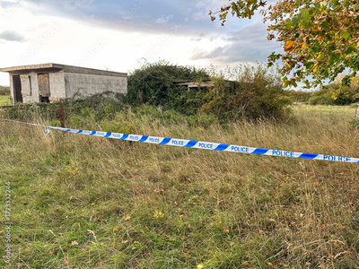 Newly installed Police cordon tape seen within a horse paddock in Britain. A major crime has been committed at this site.