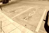 Taxi parking area with distinct markings at a busy urban intersection on a sunny day
