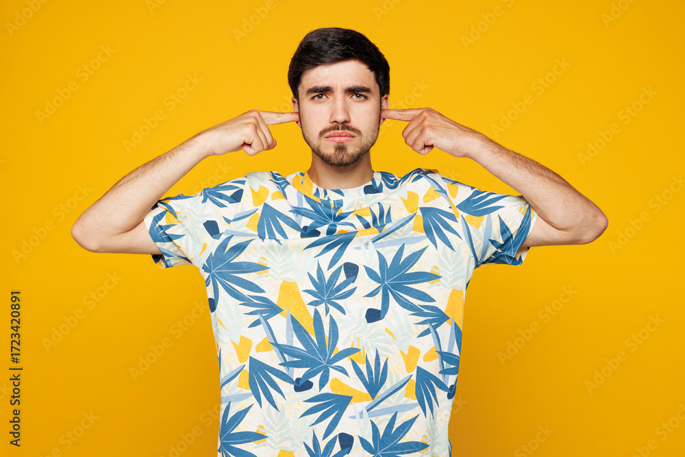 Young sad outraged man wear blue beach t-shirt casual clothes cover ears with hands fingers do not want to listen scream isolated on plain yellow orange background studio portrait. Lifestyle concept.