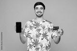 Young man wears blue beach t-shirt casual clothes using blank screen area mobile cell phone hold credit bank card shopping online order delivery book tour isolated on plain yellow orange background.