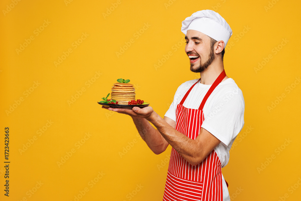 Side view young fun housewife housekeeper chef cook baker man wear red apron toque hat hold stack of pancakes on plate isolated on plain yellow orange background studio portrait. Cooking food concept.