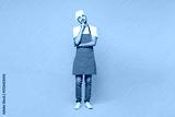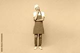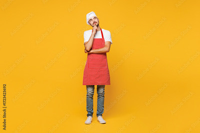 Full body young housewife housekeeper chef cook baker man wears red apron toque hat put hand prop up on chin, lost in thought isolated on plain yellow orange background studio. Cooking food concept.