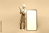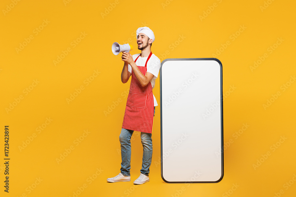 Full body young housekeeper chef cook baker man wear red apron toque hat big huge blank screen mobile cell phone scream in megaphone isolated on plain yellow background studio. Cooking food concept.