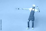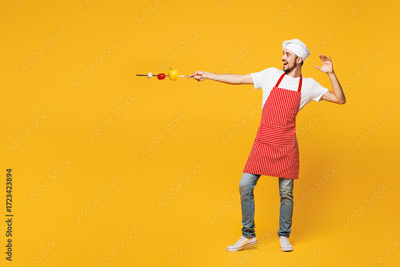Full body young housewife housekeeper chef cook baker man he wear red apron toque hat hold skewer with vegetables and fight pov fight isolated on plain yellow orange background. Cooking food concept.