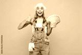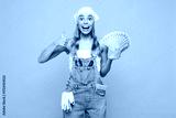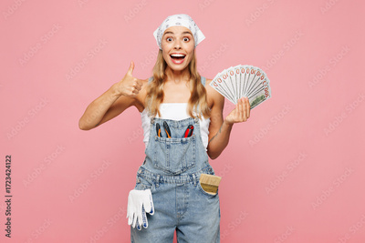 Young employee laborer handyman woman wears denim overhaul hold fan of cash money in dollar banknotes isolated on plain pink background. Instruments for renovation apartment room. Repair home concept.