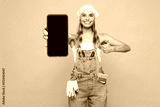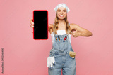 Young employee laborer handyman woman he wear denim overhaul hold use blank screen mobile cell phone isolated on plain pink background. Instruments for renovation apartment room. Repair home concept.