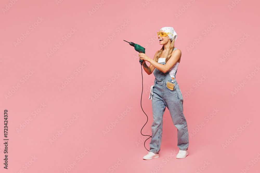 Full body young employee laborer woman wear denim overhaul glasses hold in hand electric screwdriver isolated on plain pink background. Instruments for renovation apartment room. Repair home concept.