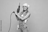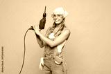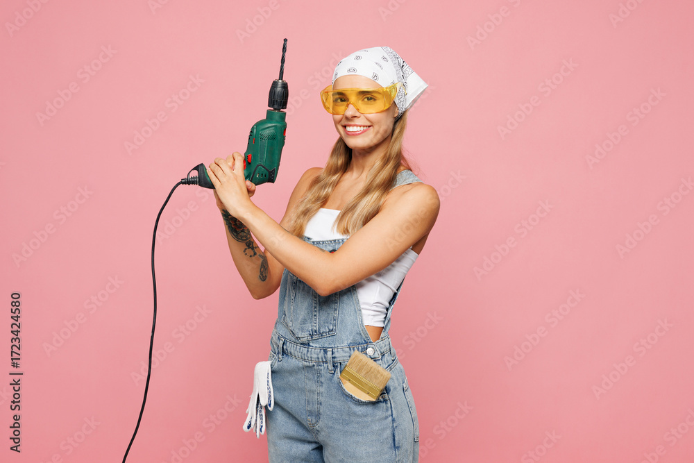 Young employee laborer handyman woman wear denim overhaul glasses hold in hand electric screwdriver isolated on plain pink background. Instruments for renovation apartment room. Repair home concept.