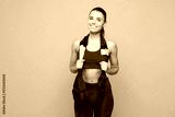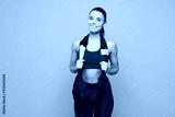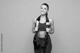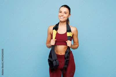 Young smiling happy fitness trainer instructor sporty woman sportsman she wear red sportswear training in home gym use hold trx loops isolated on plain blue background. Workout sport fit abs concept.