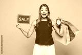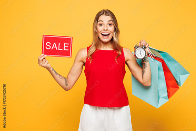 Young happy shocked woman wear red casual clothes hold in hand paper package bags after shopping, clock card sign with sale title text isolated on plain yellow background Black Friday buy day concept