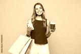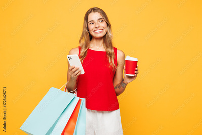 Young woman wears red casual clothes hold shopping package bags takeaway delivery cup coffee to go use mobile cell phone isolated on plain orange yellow background. Black Friday sale buy day concept.