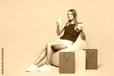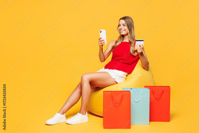 Young woman wears red casual clothes hold bags use mobile cell phone credit bank card shopping online order delivery sit in chair isolated on plain yellow background Black Friday sale buy day concept
