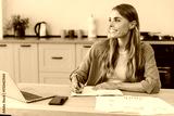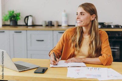 Young minded housewife IT woman wear orange shirt casual clothes hold use work on laptop pc computer write down in notebook sit at table in light kitchen at home alone. Lifestyle cooking food concept.