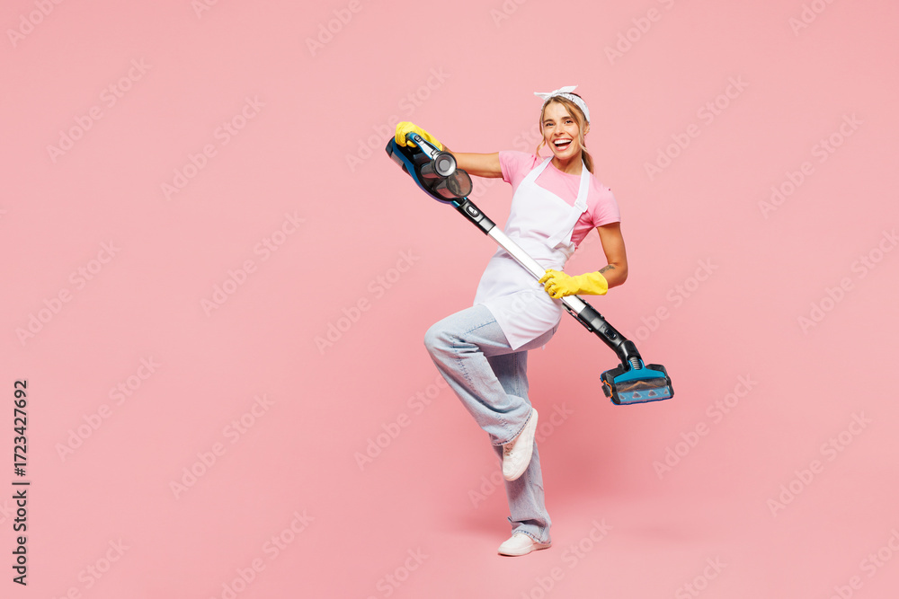 Full body young happy woman wear white apron hold use vacuum cleaner pov play guitar while doing housework tidy up isolated on plain pastel light pink background studio portrait. Housekeeping concept.