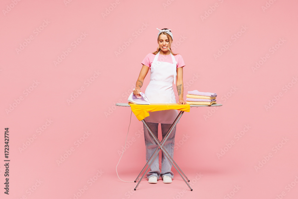 Full body young sad confused woman she wearing white apron ironing clothes on board while doing housework tidy up isolated on plain pastel light pink background studio portrait. Housekeeping concept.