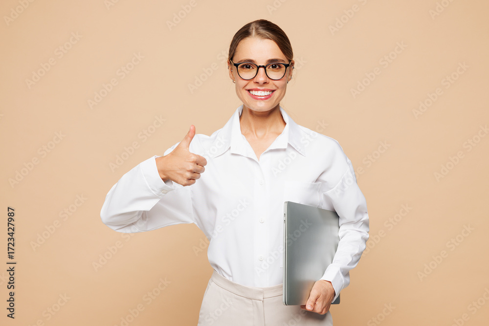 Young happy successful employee IT business woman corporate lawyer in formal white shirt glasses work in office hold closed laptop pc computer show thumb up isolated on plain beige background studio