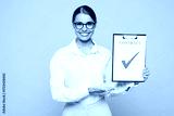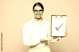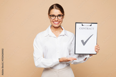 Young successful employee business woman corporate lawyer wear classic white shirt glasses work in office hold show clipboard with paper document contract agreement isolated on plain beige background.
