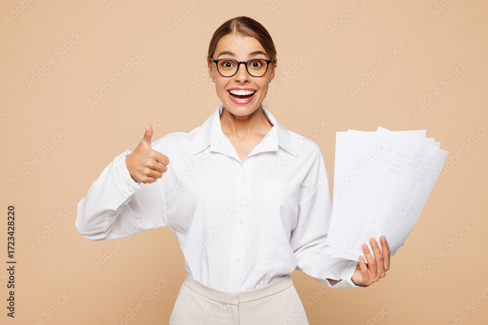 Young successful employee business woman corporate lawyer wears classic formal white shirt work in office hold paper account documents show thumb up isolated on plain beige background studio portrait.