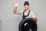 Young smiling car mechanic man wear overall hat uniform workwear clothes work in garage hold wheel change tire waving hand greet meet isolated on plain grey background. Automotive repair job concept.
