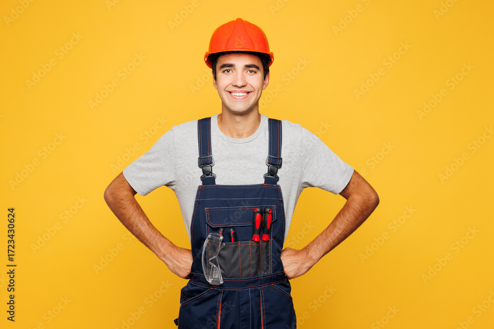 Young happy employee laborer handyman man wear helmet overall stand akimbo look camera isolated on plain yellow background. Instruments accessories for renovation apartment room. Repair home concept.