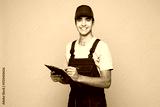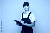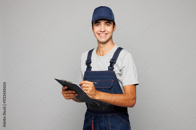 Young smiling car mechanic man wears overall hat uniform workwear clothes work in garage hold clipboard sign paper account documents isolated on plain grey background. Automotive repair job concept.