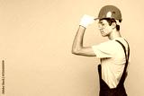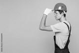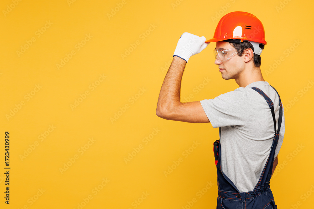 Side profile view young employee laborer handyman man wear overall goggles tipping helmet isolated on plain yellow background Instruments accessories for renovation apartment room Repair home concept