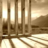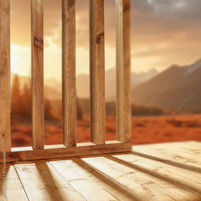 Empty wooden patio surface outdoors with warm autumn sunlight rays shining across the scene with copy space for product placement. The blurred autumn background and cozy seasonal mood.