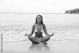 Woman meditating in ocean tide, smiling as waves touch her body, representing balance of being unplugged, self-led, joyful and deeply connected to personal well-being beyond tech reliance.