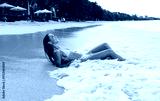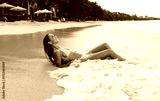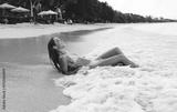 Smiling freelancer immersed in foamy shoreline, representing emotional freedom, feminine autonomy and empowered joy from stepping away from devices and choosing self over productivity.