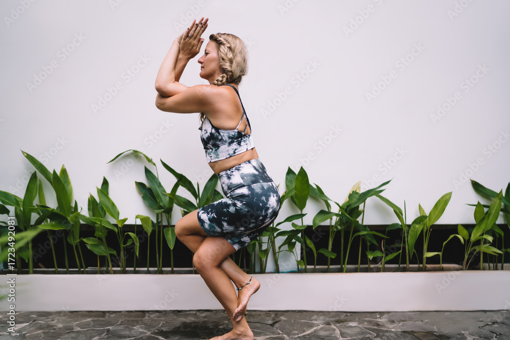Confident middle-aged woman holding Garudasana pose, symbol of focus and strength. Yoga for mental clarity and emotional stability in minimalist natural setting with peaceful mindset.