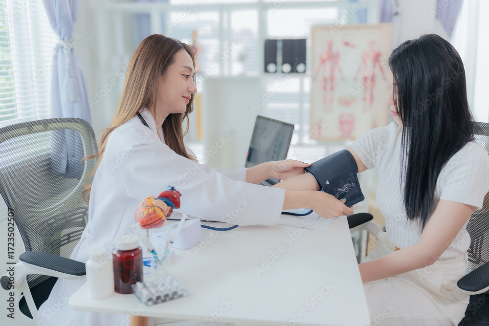 Asian female doctor measures blood pressure of female patient in clinic. Measures heart rate and blood pressure while caring for beautiful Asian patient in medical consultation.