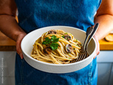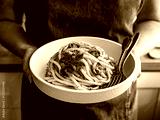 Woman holding plate with pasta with champignons mushrooms in creamy sauce and parsley, close-up