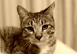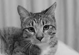 A close-up portrait of a tabby domestic cat. The cat is a Kurilian Bobtail.