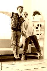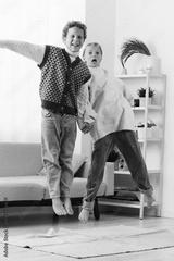 Authentic candid scene of playful siblings jumping together at home, capturing school age energy and a cozy lifestyle moment filled with warmth, joy, and everyday friendship.