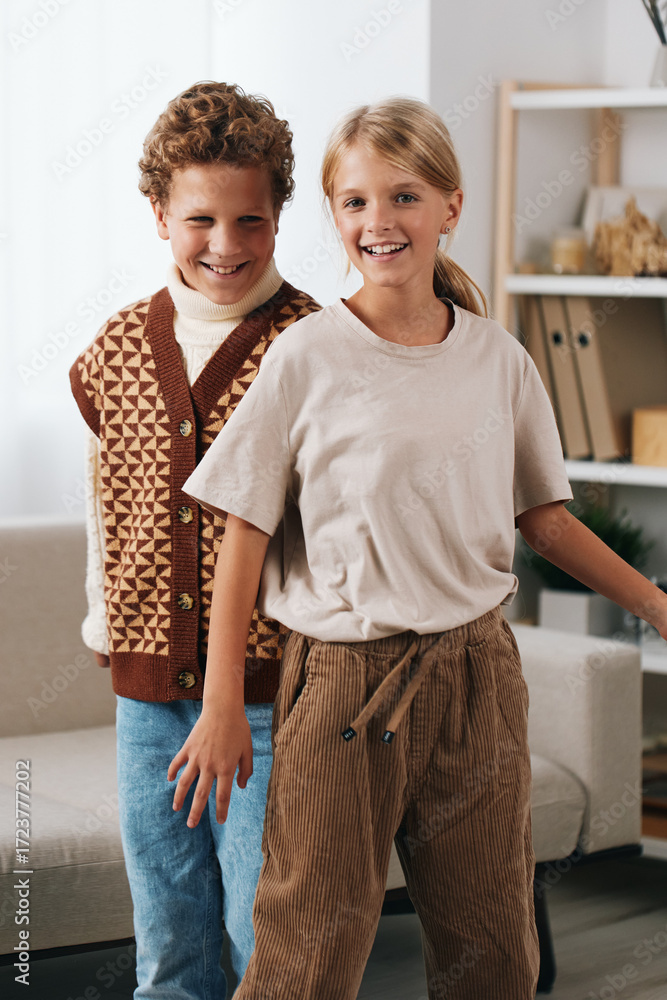 Two cheerful children pose in a cozy home setting, showcasing authenticity, school theme, and lifestyle with natural smiles and relaxed style.