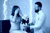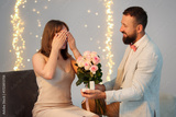 Man with engagement ring and bouquet of flowers making marriage proposal to his girlfriend on light grey background, bokeh effect