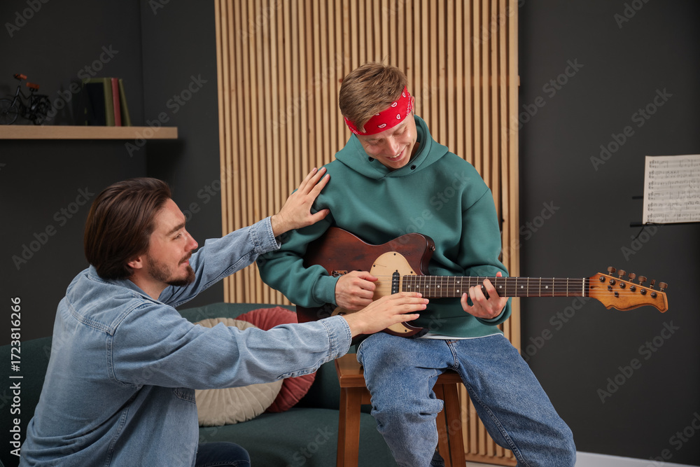 Tutor teaching man to play guitar indoors