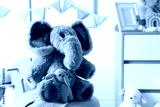 Cute soft toy elephants on pouf in child's room, closeup. Space for text