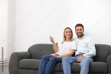 Couple using remote to control air conditioner on sofa at home. Space for text