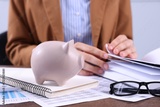 Piggy bank with paperwork on wooden table and woman working indoors, selective focus