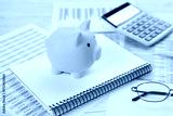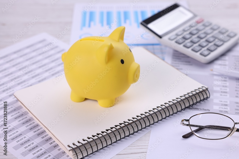 Piggy bank, notebook, calculator and paperwork on white wooden table