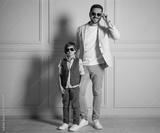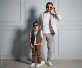 Father and son in stylish outfits posing near light wall